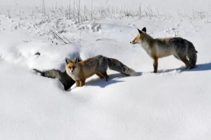 Kars'ın karlı arazilerinde gezinen ve zaman zaman yiyecek arayan kızıl tilkiler görüntülendi.