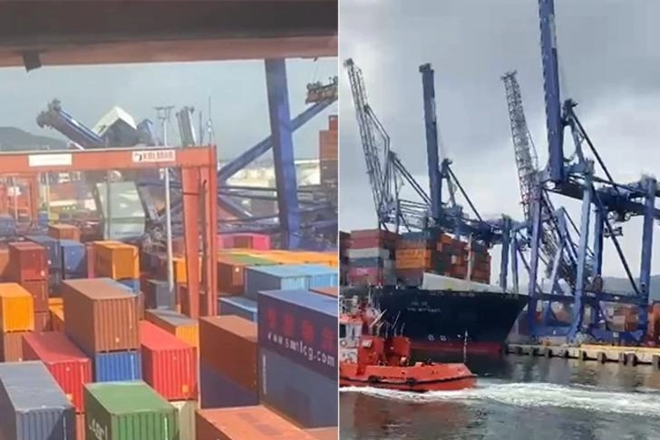 Limana çarpan geminin etkisiyle 3 vinç domino taşı gibi sırayla devrildi.