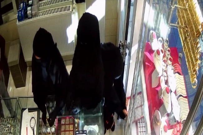 Öte yandan, kuyumcuda yaşanan hırsızlık anı iş yerinin güvenlik kamerasına yansıdı. Görüntülerde çarşaflı 3 kişiden birinin kuyumcu çalışanı ile konuşarak bir şeylere bakmaya çalışması, birisinin vitrinden yüzüklerin bulunduğu tablayı alması, diğerinin de onu gizlemek için çalıştığı görülüyor.