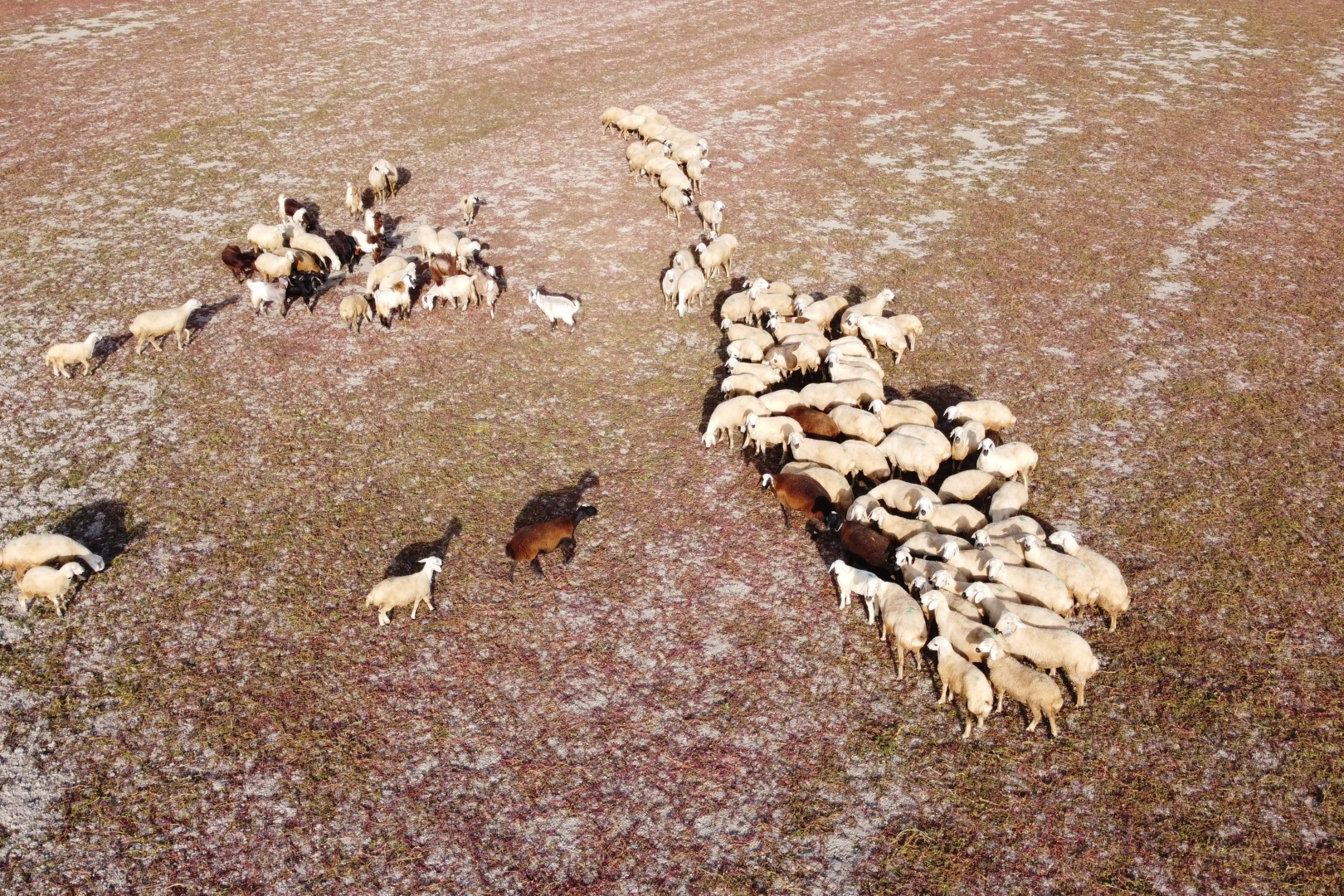 Dron kamerasıyla kaydedilen görüntülerde, Gelingüllü Barajı’nın büyük oranda kuruduğu ve ortaya çıkan geniş alanlarda koyun sürülerinin otlatıldığı görüldü.