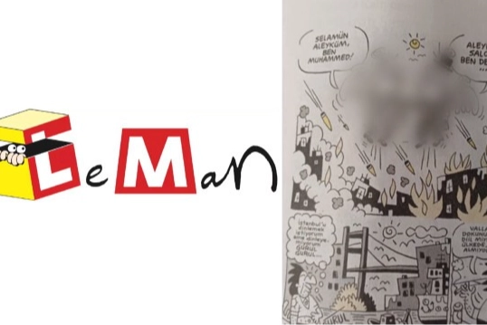 Leman’ın 26 Haziran tarihli sayısında Ortadoğu’da bombalanan bir şehrin üzerinde ‘Selamün Aleyküm’ ve ‘Aleyhem Salom’ diye selamlaşan Muhammed ve Musa adlı iki dini figür çizildi.