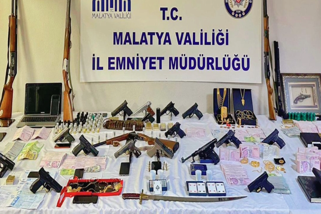 Malatya’da, Cumhuriyet Başsavcılığı koordinesinde İl Emniyet Müdürlüğü Asayiş Şube ekiplerince "Yağma tefecilik ve kumar oynanması için yer ve imkan sağlama" suçlarına karıştıkları tespit edilen şahıslara yönelik operasyon düzenlendi. Operasyonda, 36 şahsa ait 38 ikamet , 11 iş yeri ve 15 araçta yapılan aramalarda 17 ruhsatsız tabanca, 1 havalı tabanca, 6 ruhsatsız tüfek, 608 fişek, 35 bin dolar, 7 bin euro, 1 milyon TL nakit para, piyasa değeri 5 milyon TL olan ziynet eşyası, çok sayıda çek ve senet, 8 parça narkotik madde, kumar için kullanılan oyun kağıdı ve pullar, kumar hesaplarının tutulduğu defter ve ajandalar ile çeşitli dijital materyaller ele geçirildi. Operasyonda ayrıca kasten öldürme suçundan 10 yıl kesinleşmiş hapis cezası bulunan bir şahıs yakalandı. Toplamda 36 şüphelinin yakalandığı operasyonda gözaltına alınan 31 şüphelinin polis merkezindeki işlemlerinin sürdüğü öğrenildi.