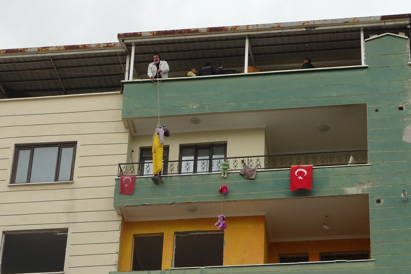 Olay, 15.00 sıralarında Yeşilyurt ilçesi Fahri Kayahan Bulvarı üzerinde meydana geldi. Edinilen bilgilere göre, 6 Şubat 2023 depremlerinde ikamet ettiği 7 katlı ağır hasarlı binanın yıkım kararına ihtiraz eden apartman sakini bir kadın, çıktığı teras katın demir ayaklarına kendini iple bağlayarak intihar girişiminde bulundu.