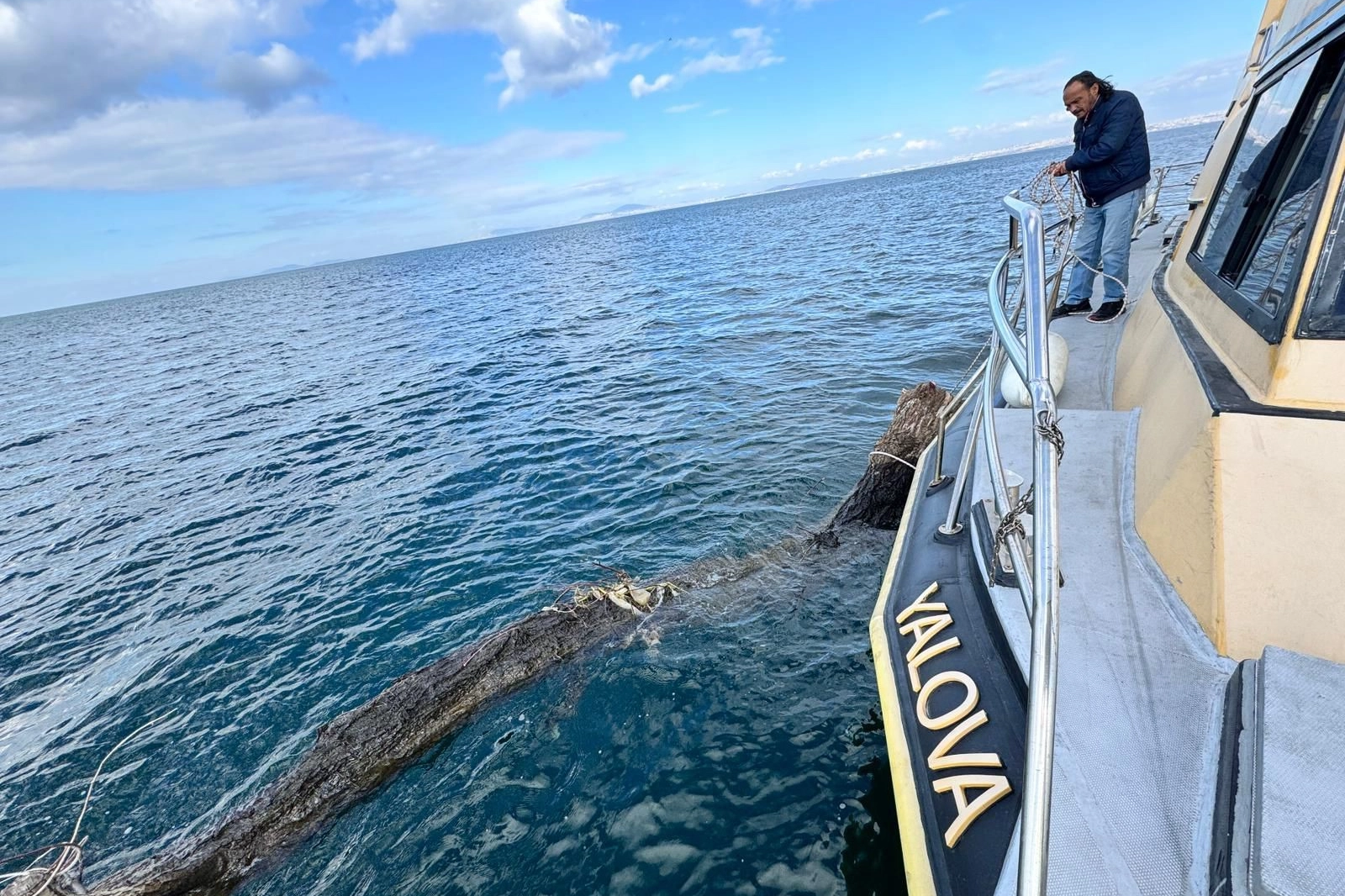 Yalova İl Tarım ve Orman Müdürlüğü Balıkçılık ve Su Ürünleri Şube Müdürlüğü ekipleri, su ürünlerinin korunması ve sürdürülebilirliğin sağlanması amacıyla yürütülen devriye faaliyetleri sırasında, İstanbul ile Yalova arasında feribotların seyir güzergâhına yakın bir noktada denizde yüzen büyük bir ağaç tespit edildi. Seyir güvenliğini olumsuz etkileyebileceği değerlendirilen yüzen ağaç, gerekli güvenlik önlemleri alınarak ekiplerin kullandığı tekne marifetiyle Merkez Balıkçı Barınağı’na çekildi.