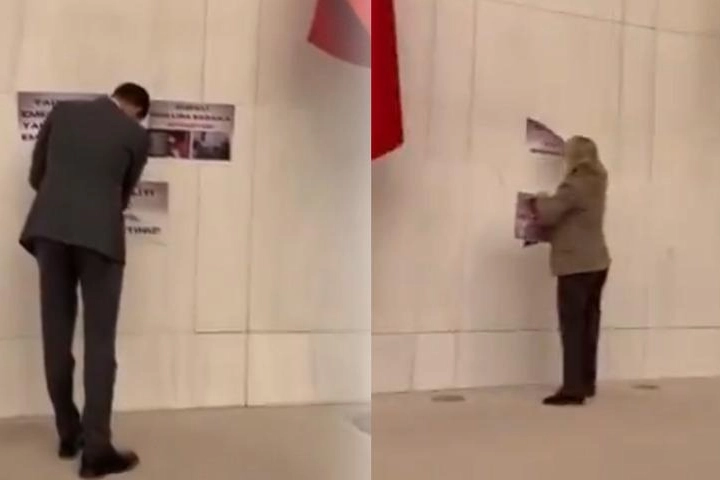 AK Parti Milletvekili Ceyda Bölünmez Çankırı da duvara asılan dövizleri sökerek Başkanlık Divanı’nın arka tarafına götürdü.
