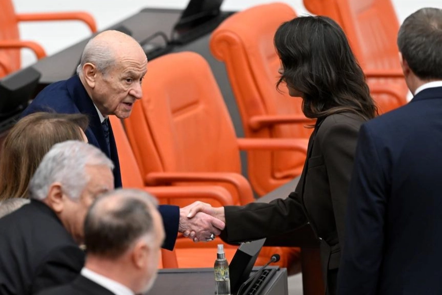 DEM Parti Eş Genel Başkanları Tülay Hatimoğulları ve Tuncer Bakırhan, Devlet Bahçeli ile tokalaştı ve kısa da bir sohbet gerçekleştirdi.