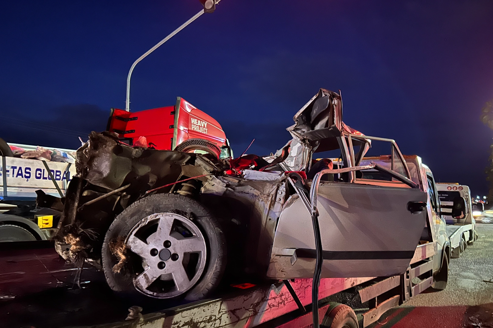 Kaza anı ise bir otomobilin araç içi kamerasına yansıdı. Görüntülerde otomobilin karşı şeride geçip kamyonun altına girme anlar yer aldı.