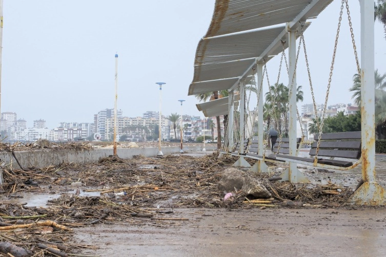 Mezitli Belediyesi ekipleri de yağışın etkisiyle sürüklenen çamur, kütük ve ağaç parçalarının biriktiği kıyı şeridini temizliyor.