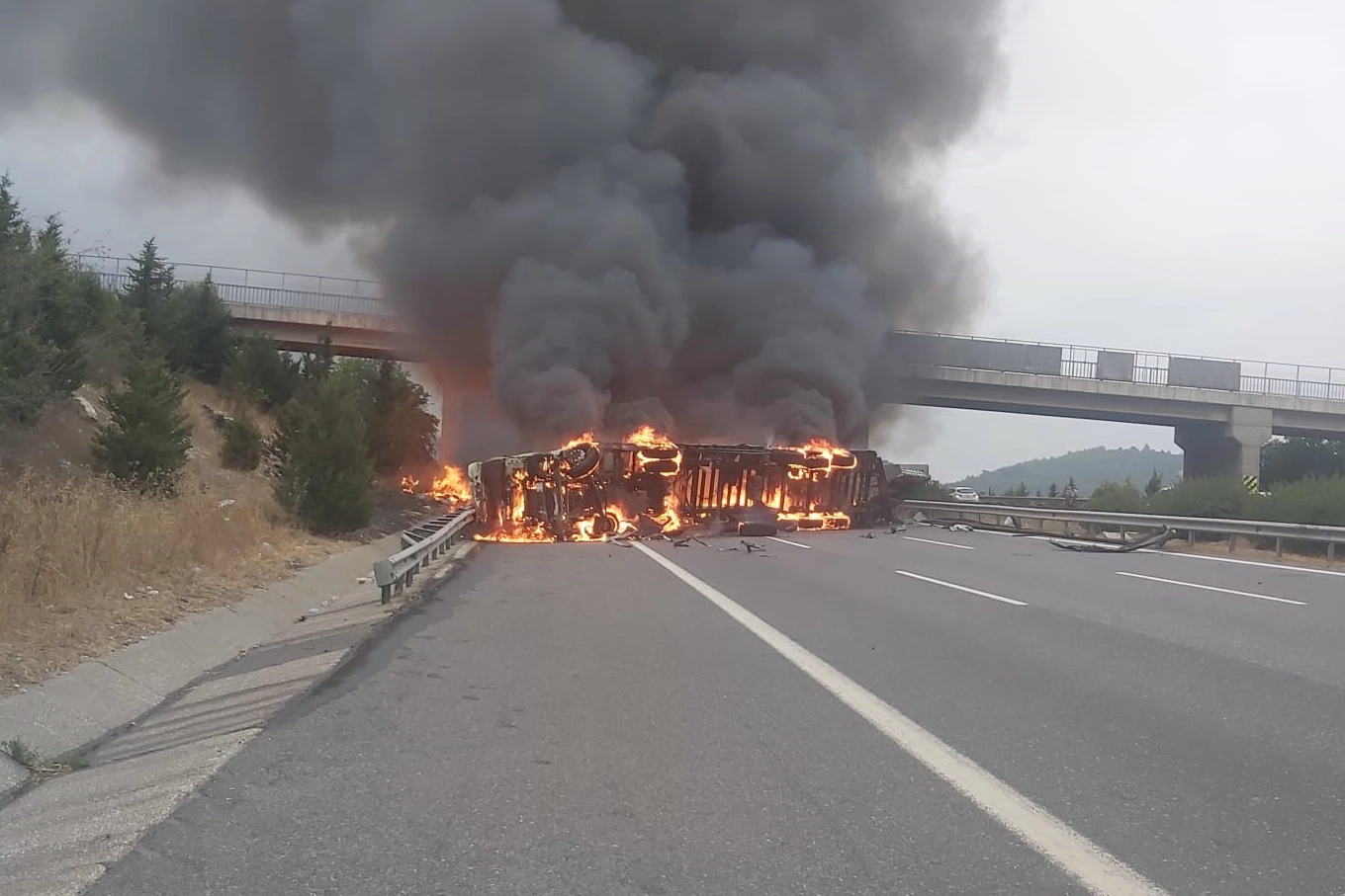 Yola savrulan tırdaki elyaf otoyolunu adeta savaş alanına döndürdü. Dumanlar gökyüzünü kaplarken, tırın lastiklerinde de patlama meydana geldi. Otoyol yangın nedeniyle trafiğe kapatıldı. İtfaiye ekiplerinin müdahalesi ile yangın söndürüldü.