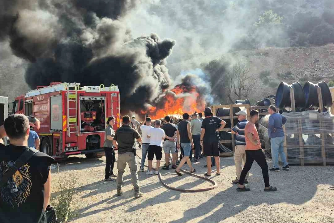 Konacık Mahallesi Gazderesi Caddesi’nde depolama alanında MUSKİ’ye ait olduğu ifade edilen borular henüz bilinmeyen bir nedenle yanmaya başladı. Yangın kısa sürede büyüdü, borular alevlere teslim oldu. İhbarın ardından itfaiye ve Bodrum Belediyesi ekipleri bölgeye sevk edildi.
