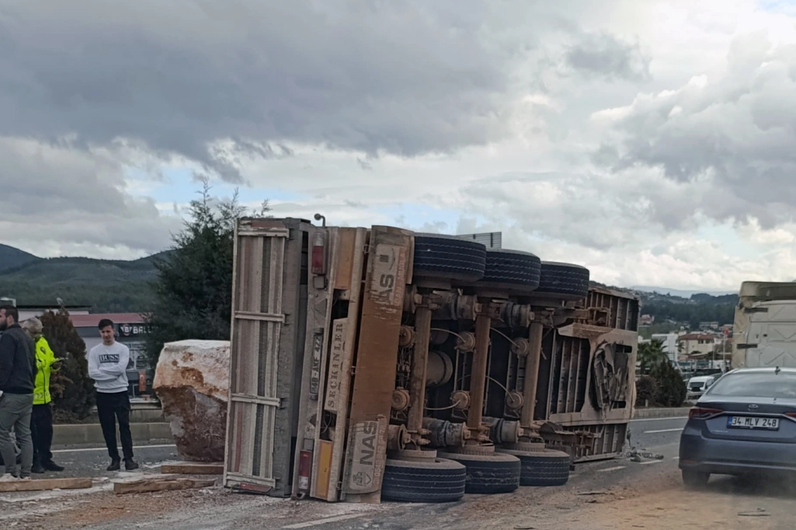 Menteşe-Yatağan karayolu üzerinde seyreden 48 AEV 906 plakalı TIR seyir halinde iken sürücüsünün direksiyon hakimiyetini kaybetmesi sonucu 48 AKF 422 plakalı dorsesi karayoluna devrildi. Mermer blok bulunan TIR’ın dorsesindeki blok mermer kaza sonrası karayoluna savruldu.