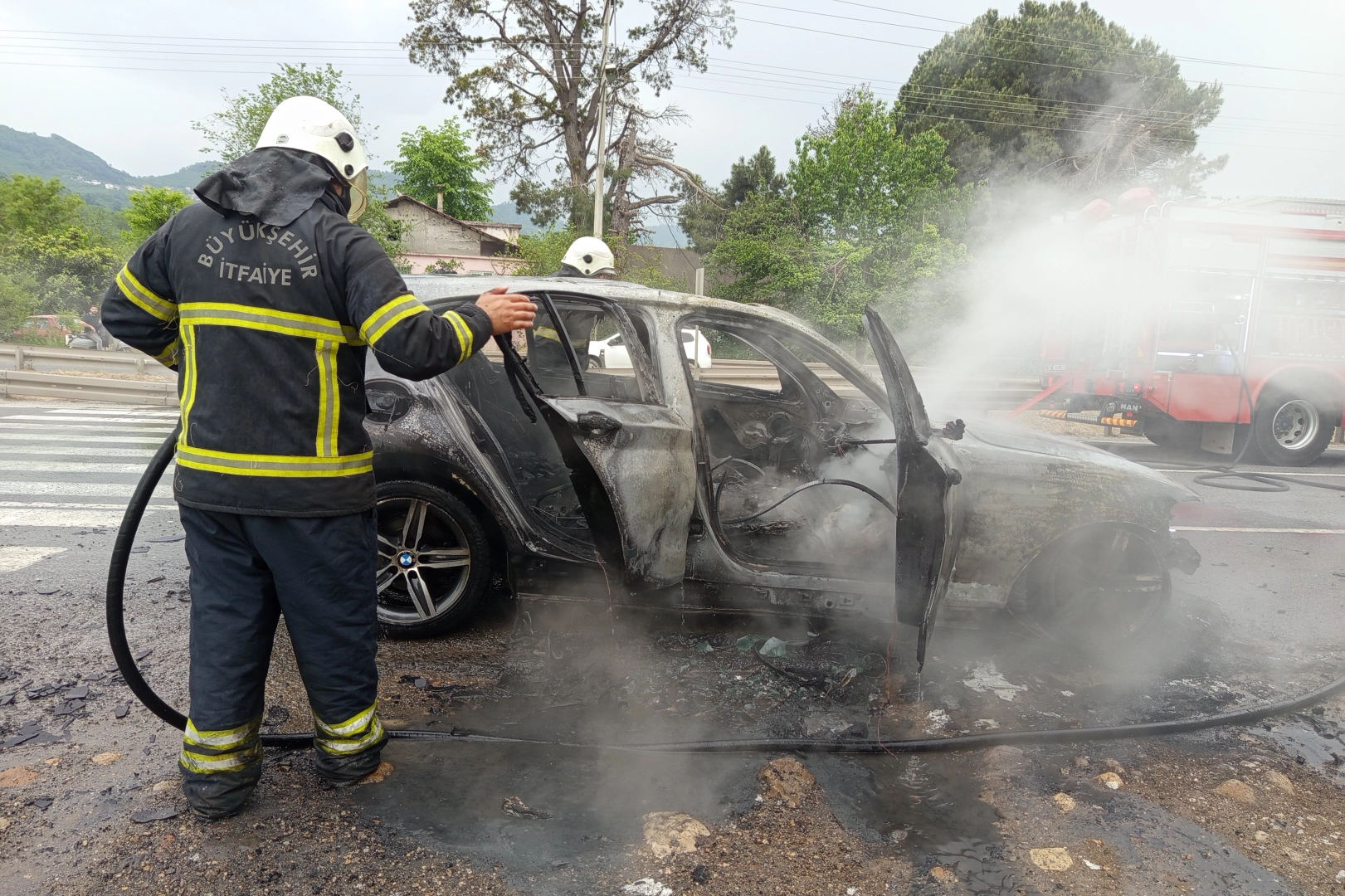 Yangın nedeniyle araç kullanılamaz hale gelirken, olayla ilgili inceleme başlatıldı.