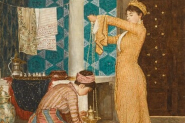 Topkapı Sarayı'nın harem bölümü tasvir edilen tabloda, kahve hazırlayan iki genç kadın betimleniyor.