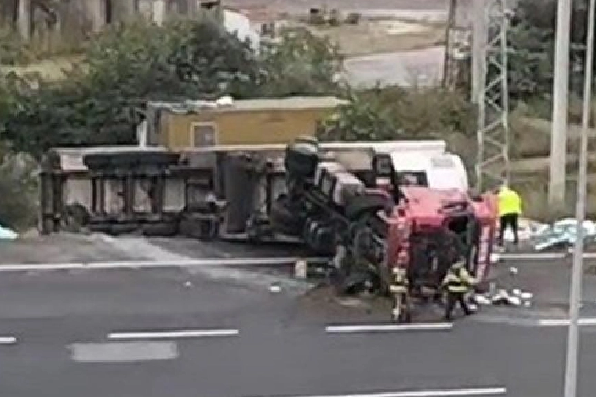 Osmangazi Köprüsü'nün Kocaeli Gebze girişi Yalova istikametinde, hafif ticari araç ile çarpışan tır devrildi.