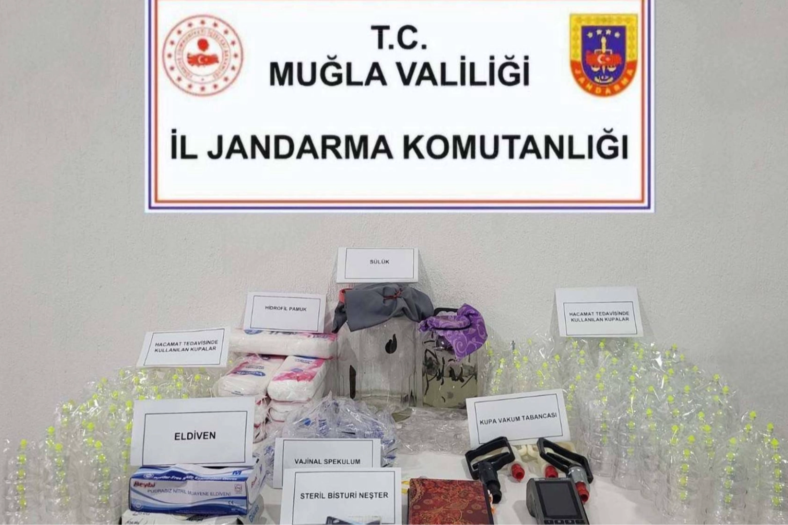 Cumhuriyet Başsavcılığı koordinesinde şüphelinin evine dün gerçekleştirilen operasyonda 107 sülük, 468 hacamat kupası, 2 paket ağızlık, 4 kupa vakum tabancası, 6 paket hidrofil pamuk, 166 steril cerrahi neşter, 2 paket cerrahi eldiven, 1 pos cihazı, 2 randevu defteri ele geçirildi.