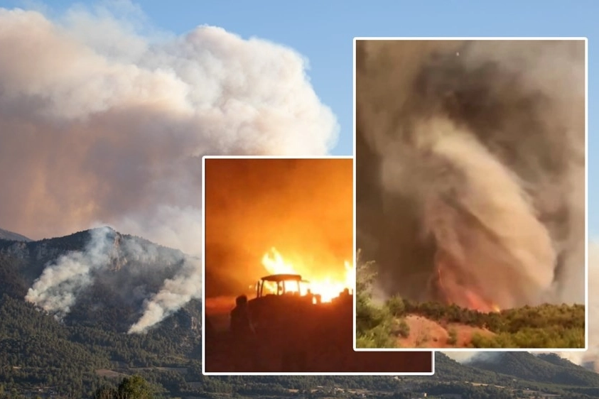 Karacabey'in paylaştığı görüntülerde, alevlerin dönerek gökyüzüne doğru yükseldiği, adeta bir yangın hortumu oluşturduğu anlar yer aldı.