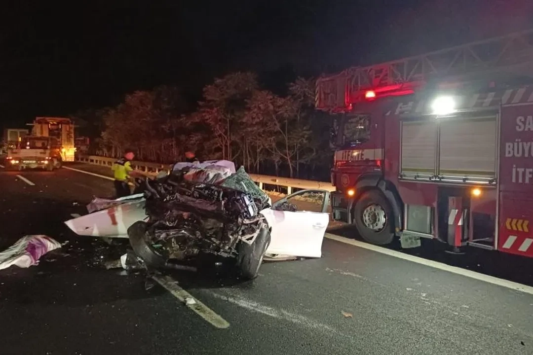 Anadolu Otoyolu Sakarya geçişinde kamyon ve tıra daha sonrasında da bariyerlere çarpan otomobil, adeta kağıt gibi ezilerek hurdaya döndü. Kazada 1 kişi öldü, 1 kişi yaralandı. Kaza, Anadolu Otoyolu Sakarya geçişi Hendek mevkiinde meydana geldi.
