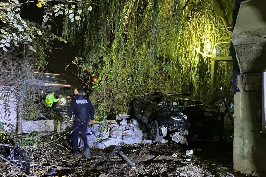 Çarpışmanın etkisiyle savrulan araçlar, yaklaşık 3 metrelik istinat duvarından yolun kenarındaki iş yerinin bahçesine devrildi.