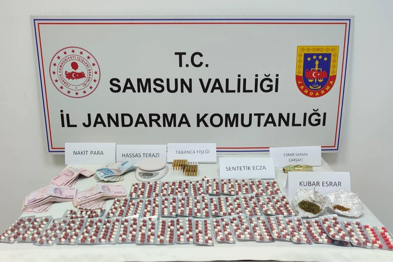 Tekkeköy İlçe Jandarma Komutanlığı ekiplerince şahısların evlerinde ve işyerinde yapılan eş zamanlı aramada toplam 600 adet sentetik ecza hap, 5 gram kubar esrar maddesi, 1 adet kubar esrar sigarası sarma çarşafı, 57 adet 9 mm çapında tabanca fişeği, 1 adet hassas terazi ve uyuşturucu madde satışından elde ettiği değerlendirilen 29 bin TL nakit para ele geçirildi. Olayla ilgili iki şahıs gözaltına alındı. Soruşturma devam ediyor.