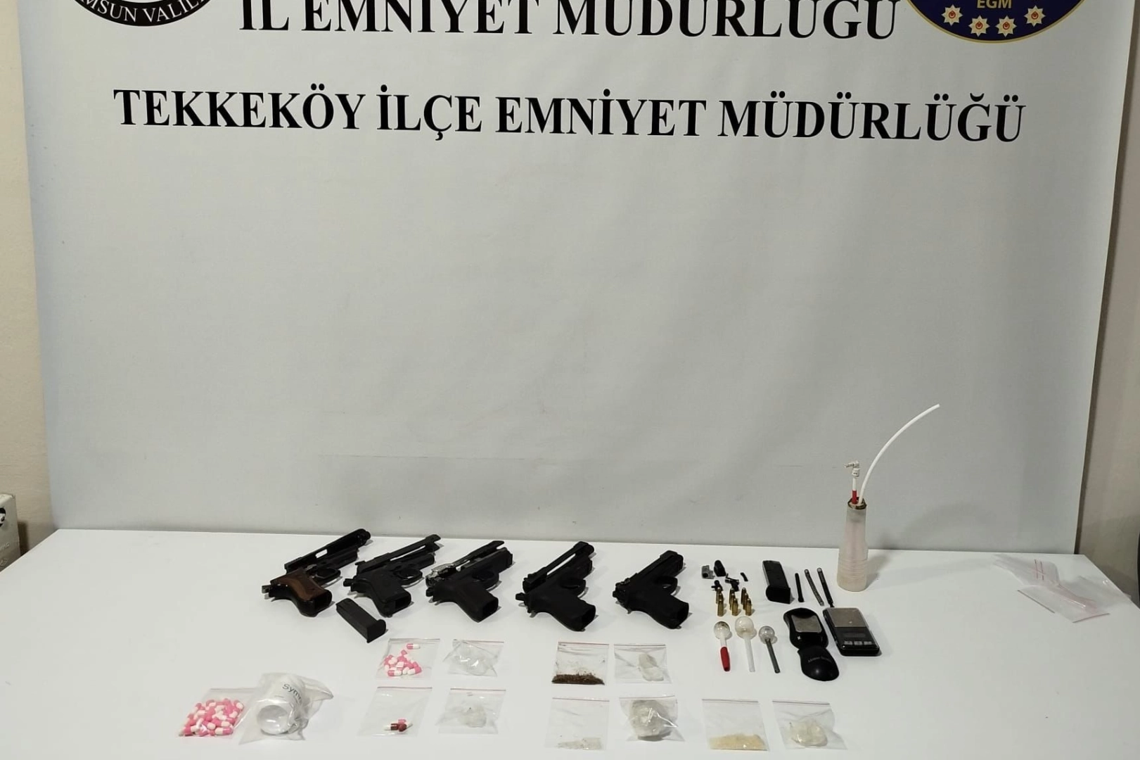 Edinilen bilgiye göre, Tekkeköy İlçe Emniyet Müdürlüğü ile Narkotik Suçlarla Mücadele Şube Müdürlüğü ekiplerince ortak yürütülen çalışmalarda, durumundan şüphelenilerek durdurulan 2 şahsın üzerinde ve iş yerinde arama yapıldı. Yapılan aramalarda 5 adet tabanca gövdesi, 5 adet tabanca namlusu, 5 adet tabanca sürgüsü ve çeşitli tabanca parçaları, 2 adet şarjör, 9 adet fişek, 2 adet hassas terazi, 7 gram metamfetamin, 1 gram bonzai, 59 adet sentetik ecza ve 4 adet uyuşturucu kullanım aparatı ele geçirildi. Olayla ilgili 2 kişi gözaltına alındı. Soruşturma devam ediyor.