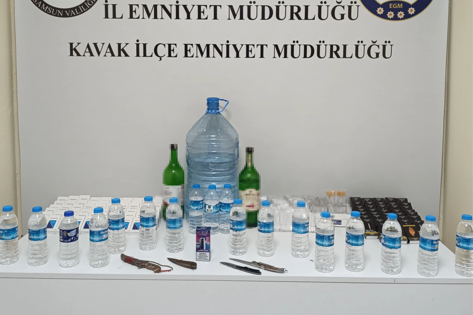 Kavak İlçe Emniyet Müdürlüğü ekipleri Soğuksu Mahallesi'nde M.G. isimli kişiye ait tütüncüde arama yaptı. Yapılan aramada ele geçirilenler ise 'pes' dedirtti. Arama sonucunda 1 adet damacana içerisinde 15 litre yapma alkol, 18 adet 0.5 pet şişe içerisinde yapma alkol ve 2 adet de cam şişe içerisinde yapma alkolün yanı sıra, 3 bin 740 adet içi dolu makaron, 4 adet bıçak ve 1 adet elektronik sigara ele geçirildi.