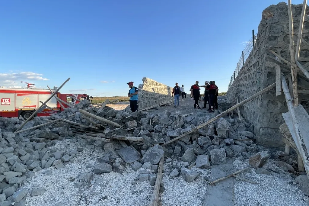Şanlıurfa'nın Bozova ilçesine bağlı kırsal Kesmetaş Mahallesi'nde M.Ç'ye ait ruhsatsız evin çevre duvarının yapımı sırasında duvar yan tarafta bulanan inşaat alanında çalışan işçilerin üzerine devrildi.