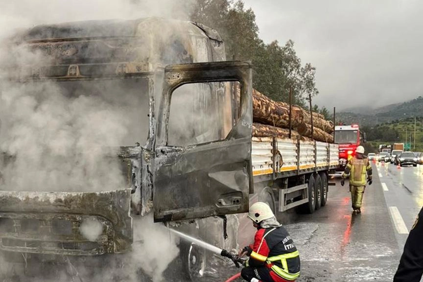K.K. idaresindeki tomruk yüklü tır, Aydın-İzmir Otoyolu 75. Yıl Selatin Tüneli yakınlarında seyir halindeyken henüz belirlenemeyen nedenle alev aldı.