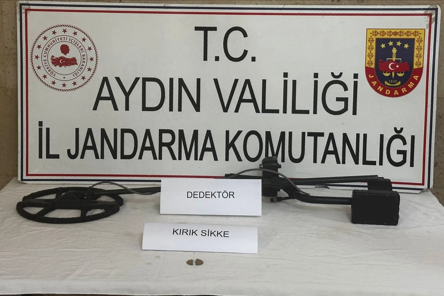 Kazı alanında ve şüphelilerin üzerinde yapılan aramada 1 adet dedektör, 1 adet kabartmalı sikke ele geçirildi.