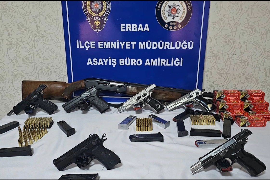 Erbaa ilçesinde düğünlerde silahla havaya ateş açılmasına yönelik yapılan çalışmalar kapsamında, İlçe Emniyet Müdürlüğü ile Kaçakçılık ve Organize Suçlarla Mücadele Şube Müdürlüğü'nün ortaklaşa yürüttüğü operasyonda 7 şüpheli tespit edildi. Şüphelilerin ikamet ve iş yerlerinde yapılan aramalarda 5 adet tabanca, 1 adet av tüfeği, 1 adet kurusıkı tabanca, 19 adet şarjör ve 849 adet fişek ele geçirildi. Şüpheliler hakkında gerekli adli ve idari işlemler başlatıldı.