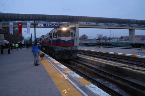 Sabahın ilk ışıklarıyla Erzincan Tren Garı'na ulaşan yolcuları, Erzincan Valisi Hamza Aydoğdu, Belediye Başkanı Bekir Aksun, Erzincan Binali Yıldırım Üniversitesi Rektörü Prof. Dr. Akın Levent ve beraberindeki kamu kurum müdürleri karşıladı.