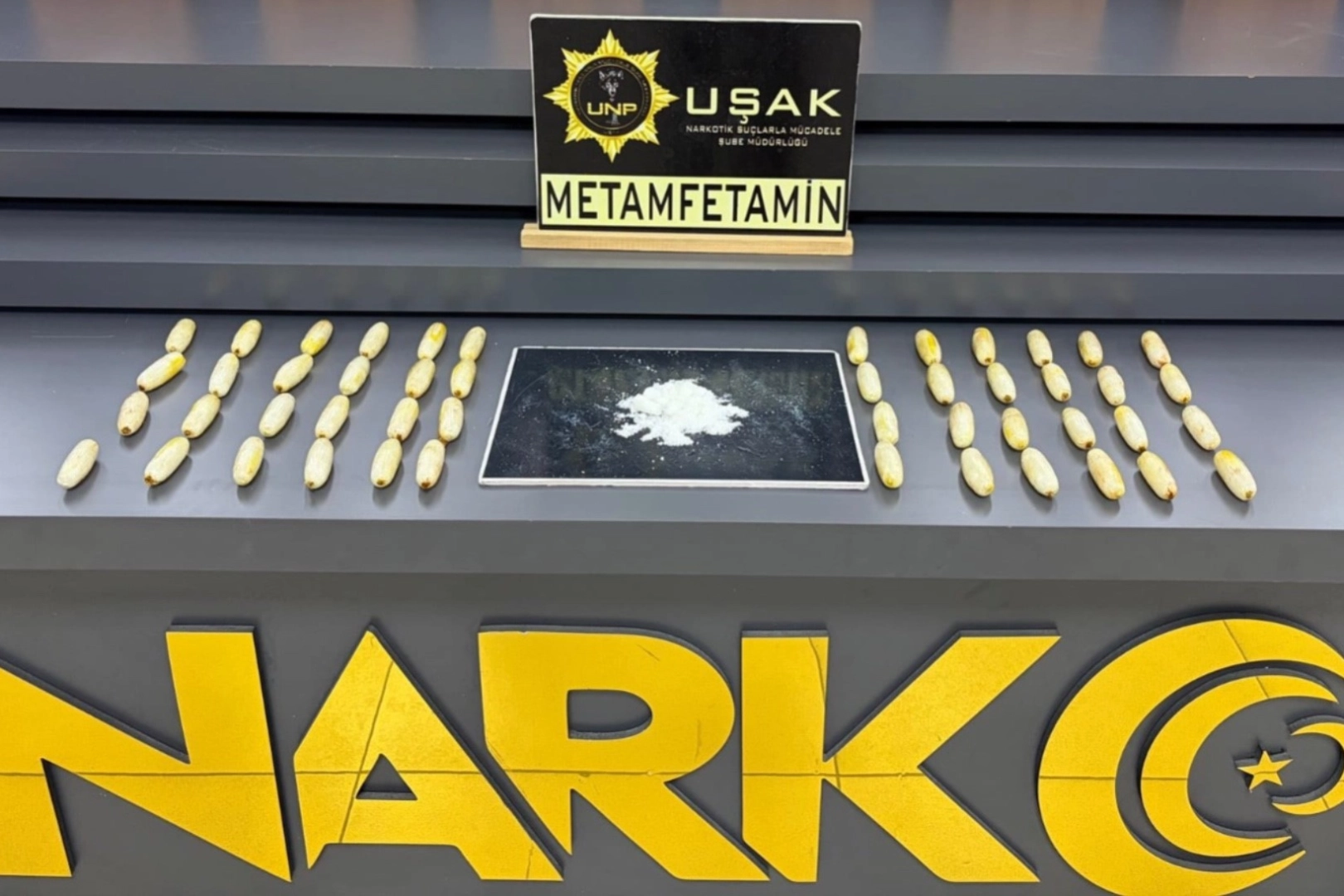 Uşak İl Emniyet Müdürlüğü Narkotik Suçlarla Mücadele Şube Müdürlüğü ekipleri, "Uyuşturucu Madde Ticareti" ile mücadele çalışmaları kapsamında yürütülen çalışmalar ve takipler neticesinde il merkezinde bir taksiyi durdurdu. Takside yolcu konumunda bulunan İran uyruklu D.G. ve A.C. gözaltına alındı.Şüphelilerin hastanede yaptırılan kontrolleri ve çekilen röntgen filmleri sonucunda mide ve bağırsaklarında çok sayıda uyuşturucu madde içeren kapsül bulunduğu tespit edildi. Hastanede kontrollü şekilde gözetim altında tutulan şüphelilerden tıbbi müdahaleler neticesinde toplam 93 parça halinde 1 kilo 70 gram metamfetamin ele geçirildi.