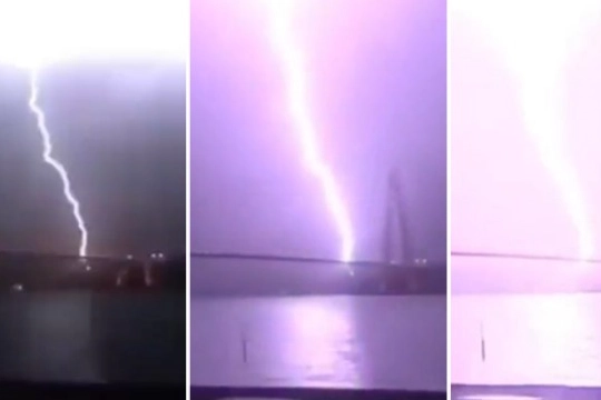 Şiddetli rüzgar nedeniyle bir kamyonete bağlı dorsenin devrildiği Yavuz Sultan Selim Köprüsü'nde gece yarısı düşen bir yıldırım kameralar tarafından görüntülendi.