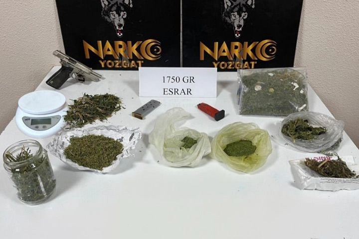 Aramalarda bin 750 gr. Esrar, hassas terazi,1 adet Ruhsatsız Tabanca, 55 adet 9,19 mm. fişek ele geçirildi.