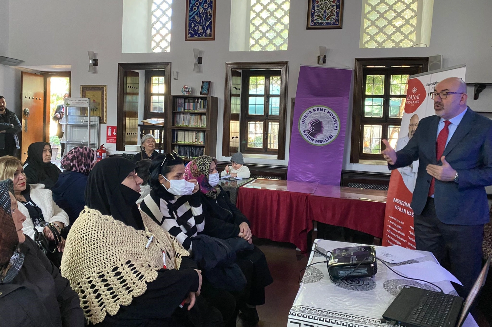 Haraççıoğlu Medresesi’nde, Bursa Kent Konseyi Kadın Meclisi üyelerine meme kanseri hakkında bilgiler veren Hayat Hastanesi Genel Cerrahi Uzmanı Op. Dr. Servet Yetgin, "Her 8 kadından birisinin meme kanserine yakalanma riski taşımaktadır. Ayrıca her 2 dakikada 1 meme kanseri teşhisi konulduğunu unutmamak gerekiyor. Meme kanseri risk faktörleri arasında, aile öyküsü, genetik, geç yaşta doğum yapmak, erken yaşta adet görmek, geç yaşta menopoza girmek, uzun süre doğum kontrol ilaçları kullanmak, menopoz sonrası hormon tedavisi görmek, alkol ve sigara tüketmek sıralanabilir” dedi.