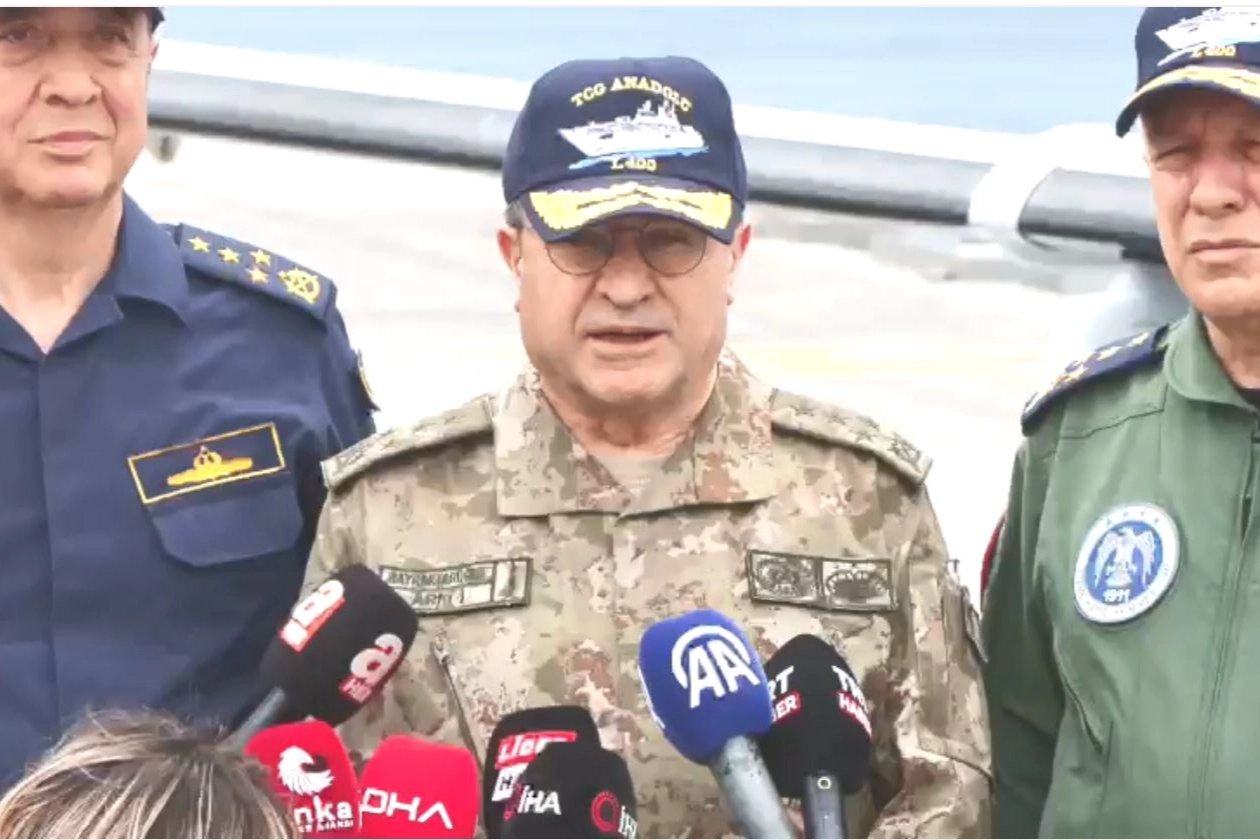 Türk Deniz Kuvvetleri tarafından 6-17 Mayıs tarihlerinde denizde, havada ve karada sürdürülen 'Deniz Kurdu 2/2025' tatbikatının 'Seçkin Gözlemci Günü' (SGG) kapsamında TCG Anadolu çok maksatlı amfibi gemisinde bulunan Kara Kuvvetleri Komutanı Orgeneral Selçuk Bayraktaroğlu, Hava Kuvvetleri Komutanı Orgeneral Ziya Cemal Kadıoğlu, Deniz Kuvvetleri Komutanı Oramiral Ercüment Tatlıoğlu, Savunma Sanayii Başkanı Haluk Görgün, BAYKAR Yönetim Kurulu Başkanı Selçuk Bayraktar açıklama yaptı.