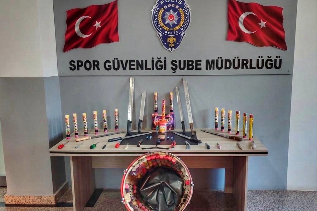 Misafir takım Göztepe taraftarlarına yönelik üst ve araç aramalarında, 80'i davul içine gizlenmiş halde 96 meşale, 130 maytap, 1 yoğun sis bombası, 8 döner bıçağı, 1 satır, 14 bıçak ile çeşitli kesici ve delici aletler ele geçirildi.