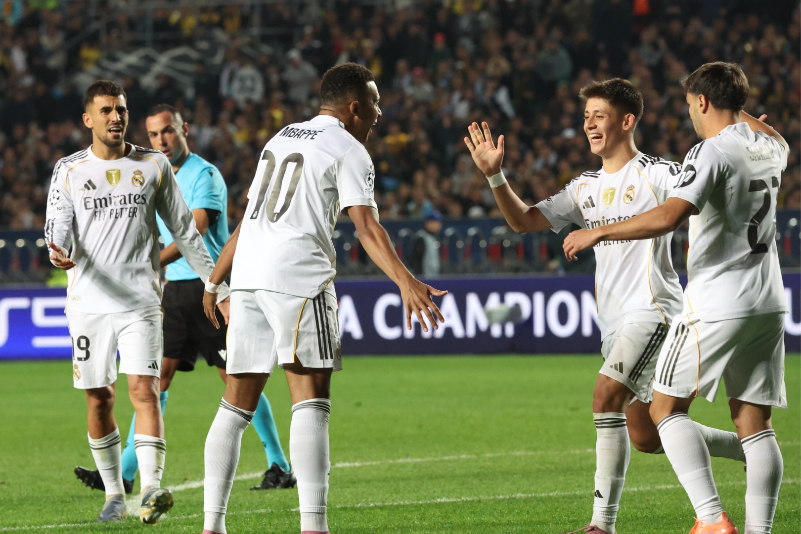 UEFA Şampiyonlar Ligi 2. hafta maçında Real Madrid, Kazak takımı Kairat Almatı ile deplasmanda karşılaştı. Milli futbolcu Arda Güler, bu mücadeleye de 11'de başladı. İspanyol ekibinde Mastantuono, kaleci Kalmurza'nın ceza sahası içinde müdahalesiyle yerde kalması sonrası penaltı kazanırken, Kylian Mbappe 25. dakikada takımını öne geçirdi. İlk yarısı bu sonuçla tamamlanan maçta Madrid ekibi 52'de farkı 2'ye çıkardı. Kaleci Courtois'nın uzun topuna hareketlenen Mbappe, kalecinin üzerinden aşırtma vuruşla fileleri havalandırdı. Kairat takımı üst üste pozisyonlara girerken, sonuç alamadı. 73. dakikada Rodrygo ile gelişen ve hızlı paslaşmalar sonrası ceza yayına gelen topu Arda Güler, tek dokunuşla Mbappe'ye bıraktı. Fransız forvet de düzgün vuruşla topu ağlara göndererek hat-trick yapma başarısı gösterdi. Arda Güler, 80. dakikada yerini Jude Bellingham'a bıraktı. Aynı dakikada oyuna dahil olan Camavinga, 3 dakika sonra gole imza attı. 71'de Vinicius'un yerine giren Brahim Diaz, 90+3. dakikada skoru 5-0'a getiren golü kaydetti.