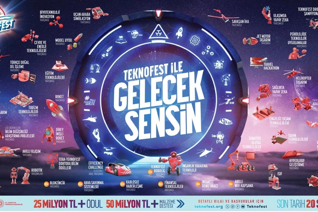 “TEKNOFEST ile Gelecek Sensin” mottosuyla prestijli yarışmalarda yüksek performans sergileyecek teknoloji tutkunlarına 25 milyon TL ödül ve 50 milyon TL’nin üzerinde malzeme desteği sağlanacak.