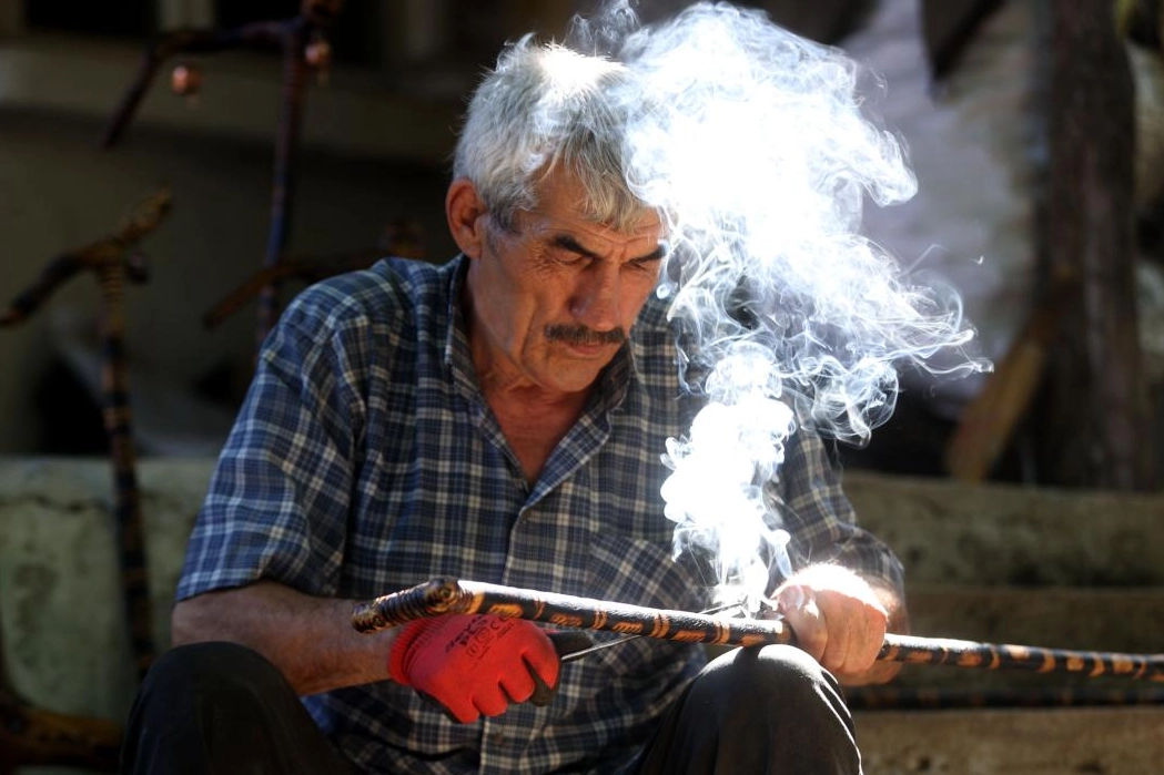 Testere ve ısıttığı demir çubuklarla doğadan topladığı ağaç dallarına şekil vermeye başlayan Olt, işlediği ahşaplardan yaptığı bine yakın bastonu evinin bahçesinde sergiliyor.