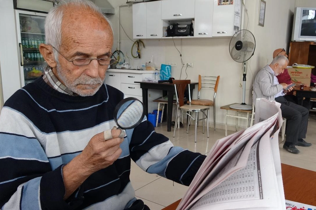 Gözlüğünün yerine evindeki 8 numaralı büyüteci kullanmaya başlayan Ötegen, o günden bu yana her sabah Mecidiye Meydan Mahallesi'ndeki Ceylan Kahvehanesi'nin yolunu tutuyor.