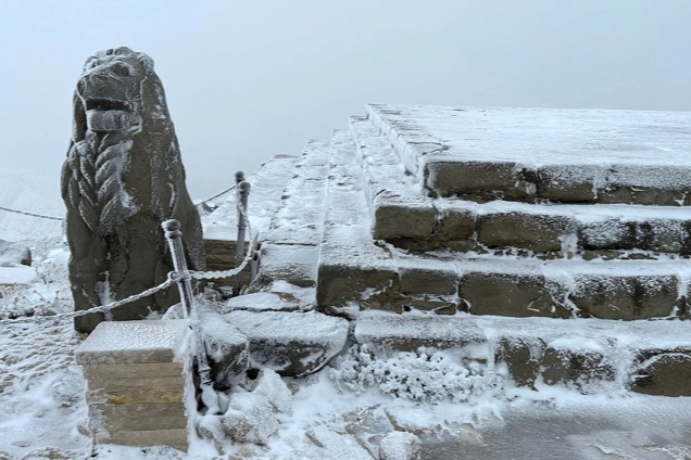 Milli Park Alanı olarak korumaya alınan ve eşsiz heykellerin yanı sıra 2 bin 150 metre yüksekliğiyle "Güneşin doğuşunun ve batışının en güzel izlendiği yer" olarak bilinen Nemrut Dağı'nda, kar yağışıyla kartpostallık görüntüler ortaya çıktı.
