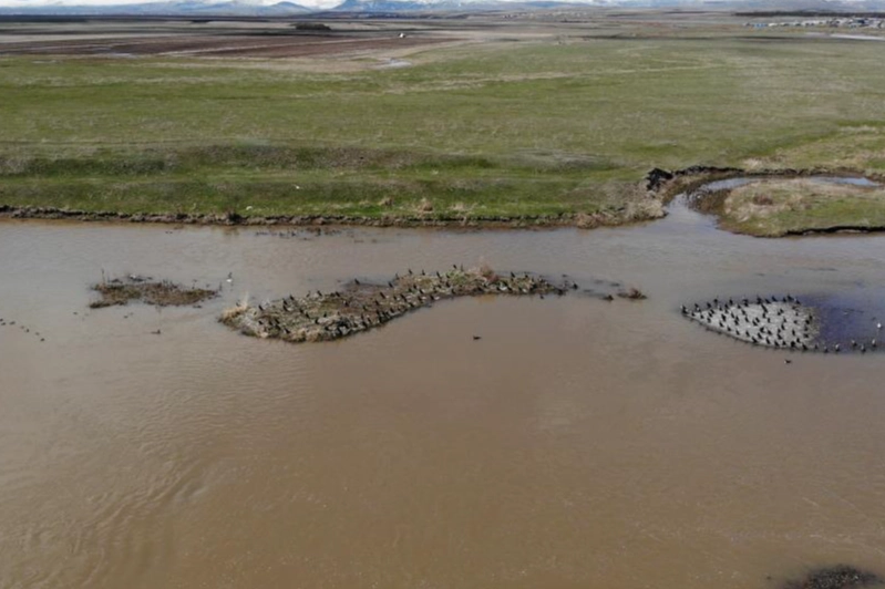 Kars'a gelirken yorgun düşen ve Kars Çayı'nda oluşan adacıklarda dinlenen karabataklar, havadan görüntülendi. Bir süre dinlenen karabataklar, daha sonra yazı geçirecekleri bölgeye kanat çırptı.