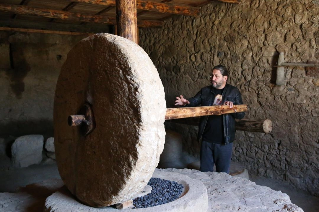 "Bakanlığımıza bu bulguların belgelerini ve verilerini paylaştıktan sonra, burayı yeniden ayağa kaldırarak, gelen ziyaretçilere zeytinyağı üretimini göstermek amacıyla çalışma yaptık. Burada zeytinler işliklerde kırılıyor, pres bölümüne götürülüyor, ahşap kollar ve mekanizmalar yardımıyla zeytinyağı sıkılarak kaplara biriktiriliyor. Daha sonra çeşitli aletlerle diğer depolama kaplarına aktarılıyor."
