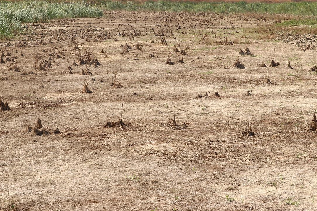 Tarımsal sulama amacıyla kullanılan gölette suyun çekildiği bölgelerde çatlaklar oluştu.