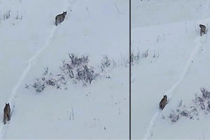 Karlı arazide peş peşe dağa tırmanırken görüntülenen vaşaklar, daha sonra gözden kayboldu.