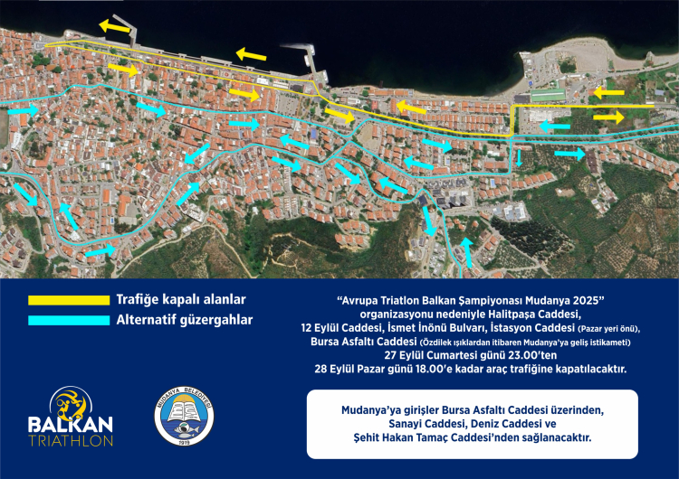 Mudanya Belediyesi, Türkiye Triatlon Federasyonu iş birliğiyle düzenlenen “2025 Avrupa Triatlon Balkan Şampiyonası”na ev sahipliği yapmaya hazırlanıyor. 28 Eylül Pazar günü şampiyona nedeniyle ilçe trafiğinde de düzenlemeler yapılacak.