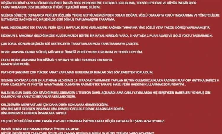 Gelinen süreçte defalarca verilen sözlerin yerine getirilmemesinden dolayı, sözlü olarak da kulüp başkanıma ve yöneticilere iletmeme rağmen tarafıma hiçbir şekilde geri dönüş yapılmamıştır.