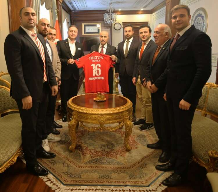 Bursa Emniyet Spor Kulübü Başkanı Erkan Yılmaz, Bursa Valisi Mahmut Demirtaş’a görevinde başarılar dilerken, üzerinde isminin yazılı olduğu kulüp forması ve Bursa Ulucami manzaralı tablo hediye etti.