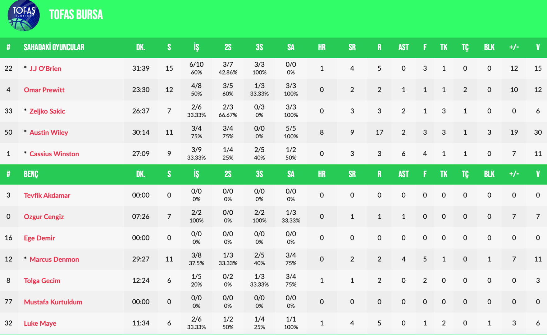 PAOK mateco deplasmanında TOFAŞ'ta J.J. O'Brien 15 sayı; Omar Prewitt 12 sayı; Austin Wiley ve Marcus Denmon ise 11'er sayıyla oynadı. Caleb Homesley, gribal enfeksiyon geçirmesi nedeniyle kadroda yer almadı.