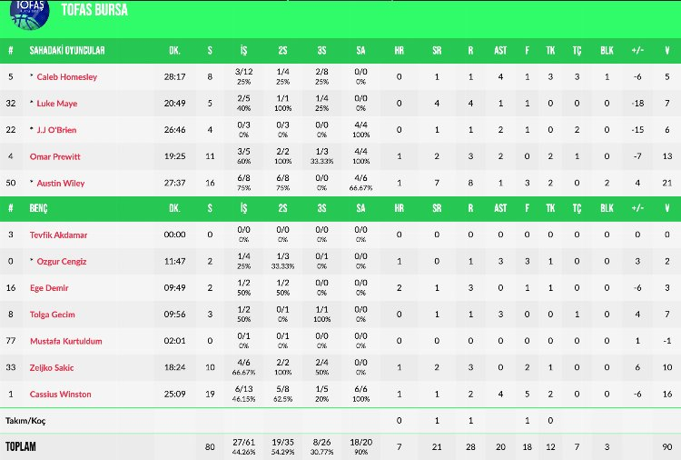 TOFAŞ: Özgür Cengiz 2, Winston 19, Prewitt 11, Homesley 8, Tolga Geçim 3, Ege Demir 2, O'Brien 4, Maye 5, Sakic 10, Wiley 16, Mustafa Kurtuldum
